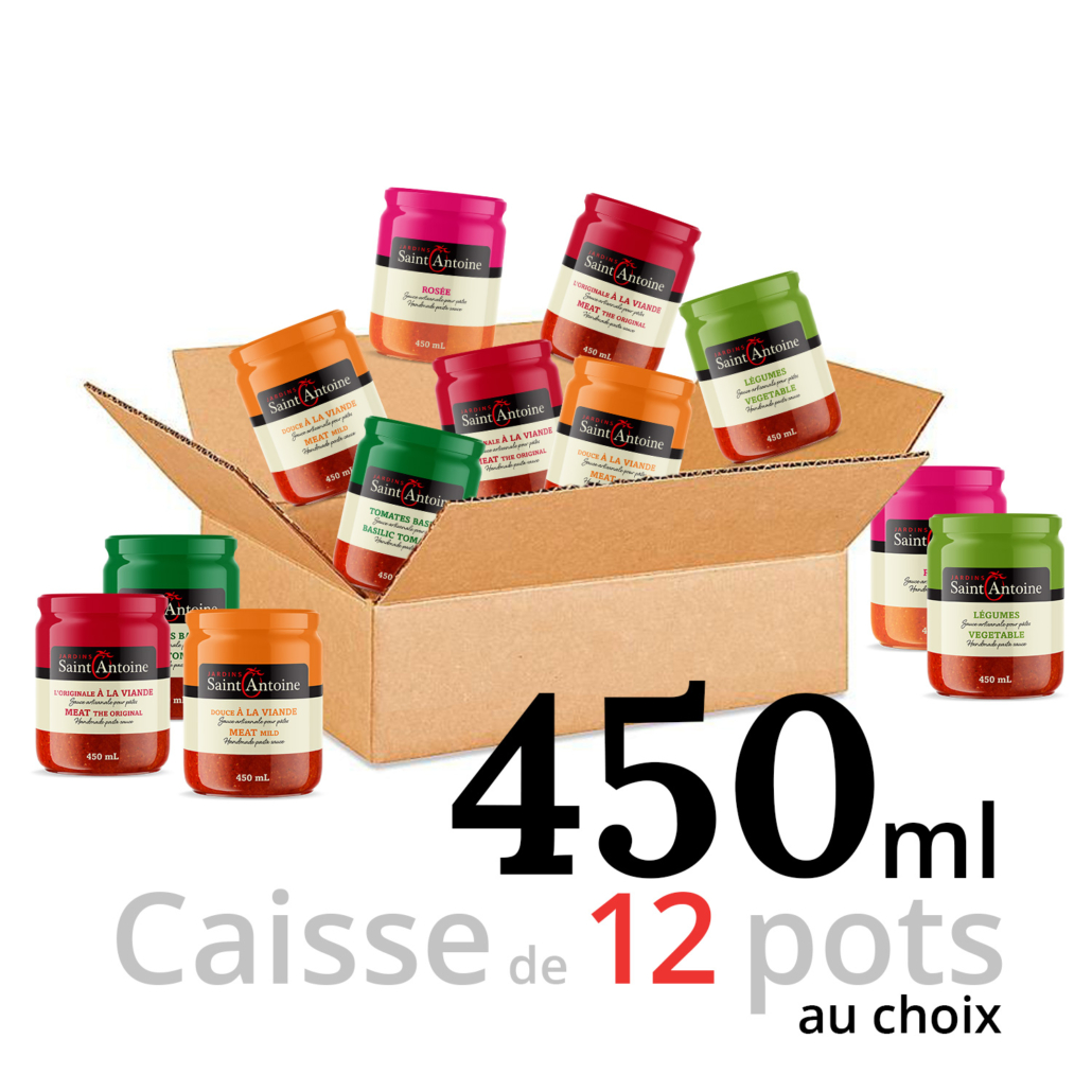 Composez selon vos préférences une sélection de 450 ml. Vous avez l’opportunité de sélectionner un ou des pots de sauce à pizza de 300 ml, mais l’ensemble de 12 pots demeure au mêm prix.