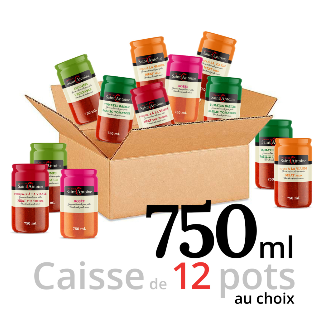 Composez selon vos préférences une sélection de 750 ml. Vous avez l’opportunité de sélectionner un ou des pots de sauce à pizza de 300 ml, mais l’ensemble de 12 pots demeure au mêm prix.
