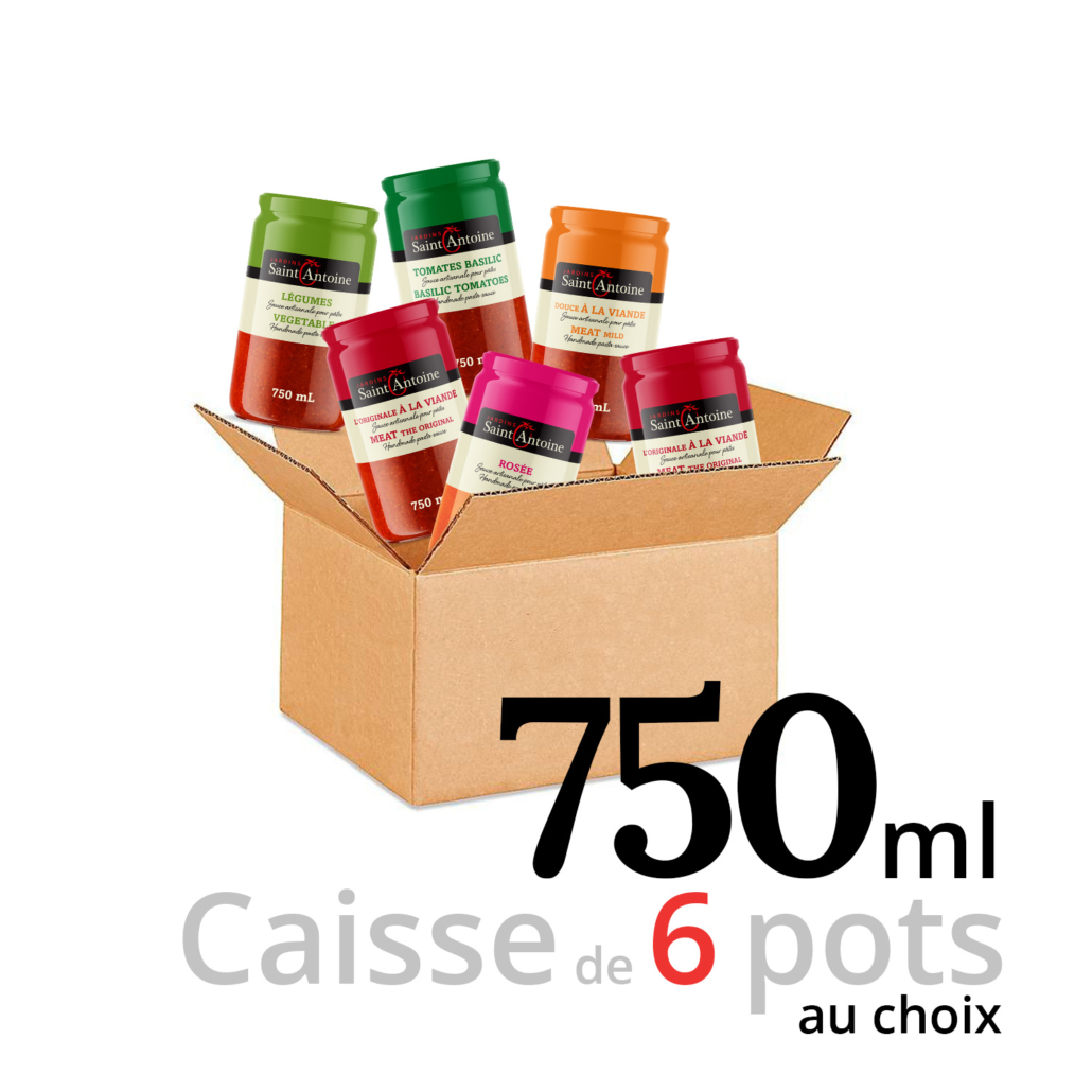 Composez selon vos préférences une sélection de 750 ml. Vous avez l’opportunité de sélectionner un ou des pots de sauce à pizza de 300 ml, mais l’ensemble de 6 pots demeure au mêm prix.